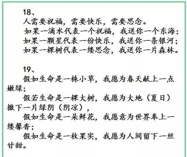 19、您不是雨露,却带来了新生的希望;您不是泉水,却带来了生命的甘甜;您不是太阳,却带来了人间的温暖;您如同溪流,没有江河奔腾的浪花,也没有大海壮阔的波澜,但山石间的那点叮咚,是您欢快的旋律;您如同星星,没有太阳耀眼的光芒,也没有月亮迷人的浪漫,但夜空中的那点光亮,是您生命价值的闪现;您如同沙砾,没有大山的伟岸,也没有溪流的悠闲,但山水间的那点铺垫,是您默默的奉献。