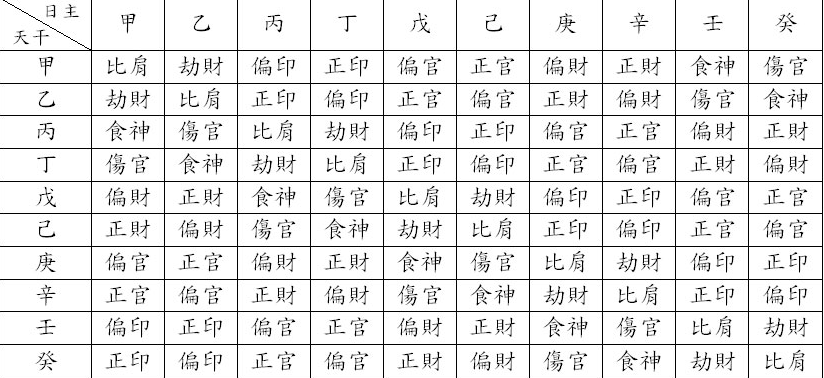 八字論命, 以干支陰陽五行的生克制化、刑沖合害為基礎,從日柱的日干與其他各干支的關係而定出:比肩、劫財、食神、傷官、偏財、正財、七殺、正官、偏印、正印十個專有名詞,稱為“十神”。其天干是陽干見陰乾,陰乾見陽干為正,陽干見陽干,陰乾見陰乾為偏。