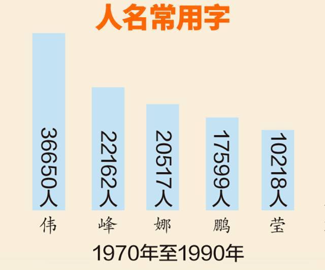 三四十岁年龄段的男性名字叫“伟、鹏、峰、磊”,女性名字叫“娜、慧、莹”的特别多,可近几年给新生儿落户的,很少看到名字里带这些字眼的。