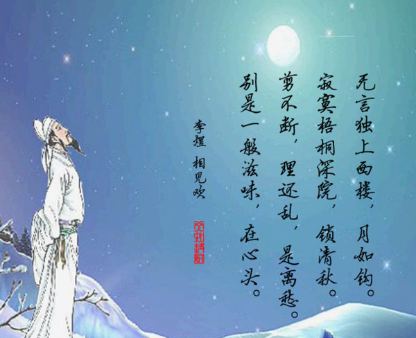 白话文释义:默默无言,孤孤单单,独自一人缓缓登上空空的西楼。抬头望天,只有一弯如钩的冷月相伴。低头望去,只见梧桐树寂寞地孤立院中,幽深的庭院被笼罩在清冷凄凉的秋色之中。那剪也剪不断,理也理不清,让人心乱如麻的,是离愁。那悠悠愁思缠绕在心头,却又是另一种无可名状的痛苦。