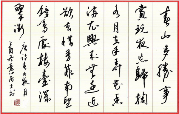 释文:青山多胜事,赏玩夜忘归。掬水月在手,弄华香满衣。兴来无远近,欲去惜芳菲。南望鸣钟处,楼台深翠微。