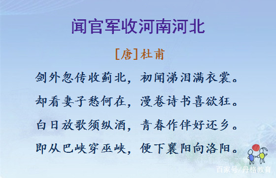 剑门外忽传收复蓟北的喜讯,刚听到这件事时我禁不住泪水洒满了衣衫。