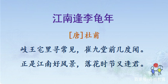 李龟年:唐朝开元、天宝年间的著名乐师,擅长唱歌。因为受到皇帝唐玄宗的宠幸而红极一时。“安史之乱”后,李龟年流落江南,卖艺为生。杜甫在潭州(今湖南长沙)偶然相遇。