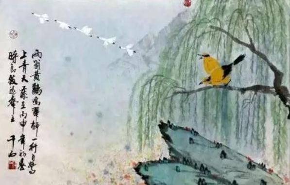 译文:两只黄鹂在翠绿的柳树间婉转地歌唱,一队整齐的白鹭直冲向蔚蓝的天空。我坐在窗前,可以望见西岭上堆积着终年不化的积雪,门前停泊着自万里外的东吴远行而来的船只。