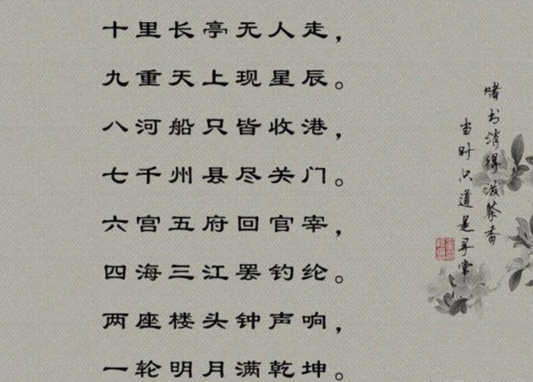 这是宋代邵雍描写一路景物的诗,共20个字,把10个数字全用上了.这首诗用数字反映远近、村落、亭台和花,通俗自然,脍炙人口.