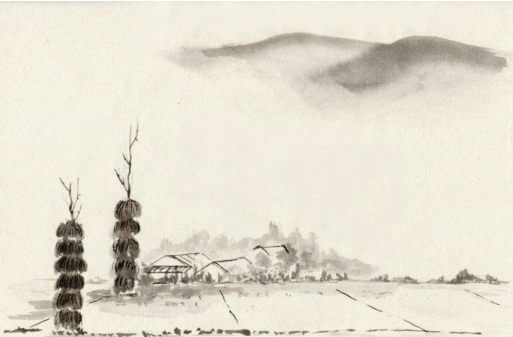天色渐渐昏黄,暮色中的云层难以分辨,仿佛化作了这满地的露点。一钩新月模仿着扇形,在天上高悬。逼近了,逼近了,成“一”字的横线在空中排开,那是北方飞来的大雁。