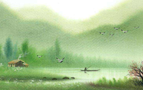 柳永 安公子 长川波潋滟。楚乡淮岸迢递,一霎烟汀雨过,芳草青如染。驱驱携书剑。当此好天好景,自觉多愁多病,行役心情厌。望处旷野沈沈,暮云黯黯。行侵夜色,又是急桨投村店。认去程将近,舟子相呼,遥指渔灯一点。