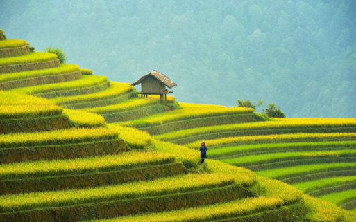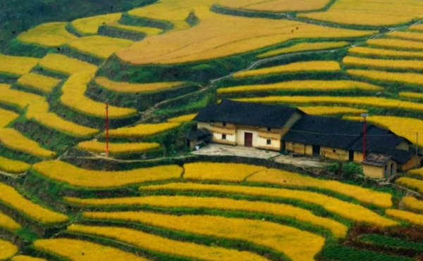 7﹑有趣的是,在这浩瀚如海的梯田世界里,最大的一块田不过一亩,大多数只能种一二行禾的“带子丘”和“蚂拐(即青蛙)一跳三块田”的碎田块。梯田的景色随季节的改变而变化,春叠银带,夏翻绿浪,秋垒金阶,冬盘苍龙——告诉您一个小秘密,领略龙脊梯田魅力的最佳时机是农历“芒种”及“中秋”两个季节的前后。“芒种”为当地村民的春耕时节,但见云雾弥漫于阁楼梯田间,如镜的梯田中点缀着耕牛、衣着火红的耕者、碧绿的秧苗,绝对是一幅气势磅礴的造化写意。