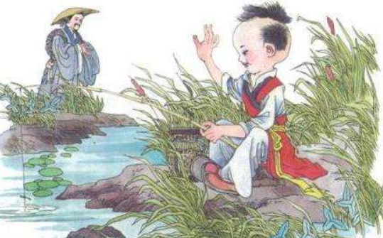 一个头发蓬乱、面孔青嫩的小孩在河边学钓鱼,侧着身子坐在草丛中,野草掩映了他的身影。听到有过路的人问路,小孩漠不关心地摆了摆手,生怕惊动了鱼儿,不敢回应过路人。