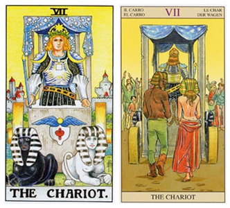 这张牌描绘的是克服障碍、获得胜利的王者战车。牌面上的胜利者以一种强有力的姿态站在战车上,展现他在人世间的丰功伟业。拉动战车的一黑一白两只狮子,时刻准备继续前进。