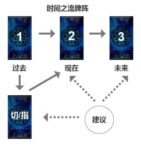 这是最基本的牌阵。它是初学者必学的时间性牌阵,也是许多牌阵的基础。“时间之流”这个名称是为了方便另取的,它原来的英文名字很朴实,就叫“Three Card Spread”。时间之流牌阵怎么摆?下面是时间之流牌阵的摆放位置,各位置涵义如下: