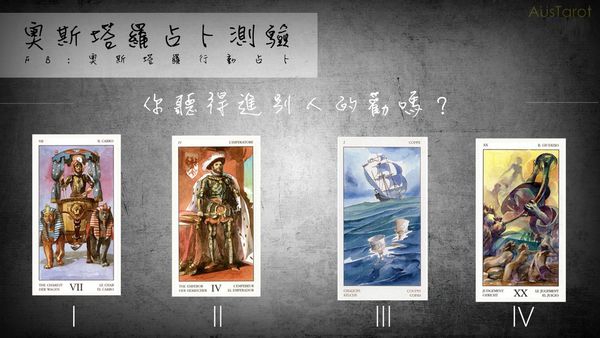 选择到这组牌的朋友,基本上要说你的是个不听劝人也不是,但你们就相当的特别!因为这样的牌组多半代表的是意志力以及成功的涵义!所以不知道你有没发现,若是你们很有把握的事情,大多时候你们会默默地完成!但如果是把握不高或是看似有问题的,你们就会求助朋友!但重点来了,你们就是那种问完朋友还是按照自己想法做选择的人!标準的爱问又不听,嗬嗬!所以奥斯有时还是要帮你们朋友抱不平一下啰!虽然这牌组的朋友通常都挺聪明,也都能做出明智的决定!但还是要参考一下朋友意见啦!毕竟观点不同有时考量的也不一样!综合一下比较全面唷!