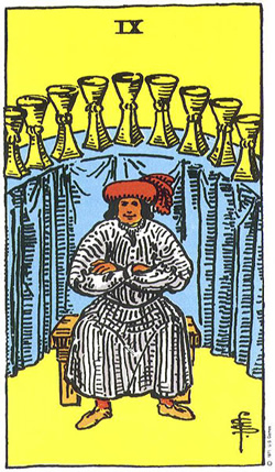圣杯九这一张牌代表着,目前正是一段内在与外再互相调和得很好且满足现况的牌,虽然在圣杯牌组里,暗示满足的牌不算少,但是能达到像圣杯九这一张牌的满足感则可以说很少,因为圣杯九这一张牌的满足感是双重的,也就是说内在与外在的满足感都具备,而在另外一方面来说,圣杯九这一张牌的出现也暗示着,目前正是一段成功的时期,之前的努力与奋斗,让外在的物质层面与内在的精神层面都丰富充满,而自己也正在这样子的情境里面享受着成果,这时候也是把那过去的经验与目前的成果拿出来与亲朋好友分享的时候了。