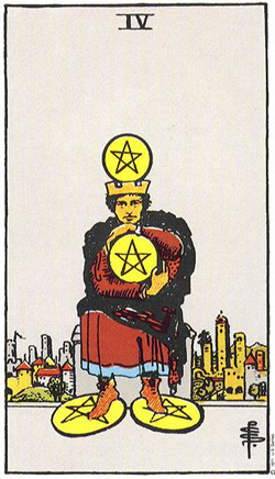 正位的星币对物质财富的喜爱。囤积者。放高利贷者。吝啬鬼。无法与人分享。稳定的财务规划、自私、占有欲、投资正确、利益的交换.金币四数字四出现时也常常暗示问题与财物有关,当事人往往必须采取着小心谨慎的财物态度(通常这张牌出现时他们已经警觉,而且也开始这么做),在反面时则象征着,拖延、问题难以解决,在金钱上的问题则需要更谨慎的规划与重新开始.
