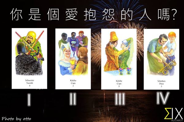收到这张牌的朋友,抱怨还是适可而止就好喔!面对一些状况,虽然你看不惯或是不如你意,但也不要以抱怨的方式呈现你的不满!而且这张牌轻易透露出三分钟热度导致事情做不到理想目标的含意,所以也要注意一下这样的状况发生喔!而且有时当结果不满意时,你可能就会跟周遭朋友抱怨东抱怨西,最后连朋友都有点看不下去,所以奥斯会建议,除了要收起抱怨的个性做事也要持续加油喔!
