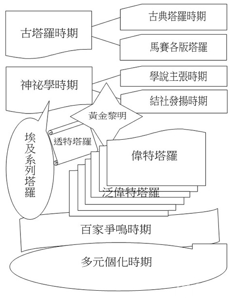 塔罗发展初期出现过各式各样的塔罗牌,到了中间的交叉点,则有了塔罗的定义编制:78张。在这交叉点之后,依之前的定义开始,又新增其他各种的塔罗牌。这就是塔罗定义的变化综观。也就是据此公认标准才能有更多新奇变化。