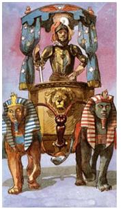 这张牌描绘的是克服障碍、获得胜利的王者战车。牌面上的胜利者以一种强有力的姿态站在战车上,展现他在人世间的丰功伟业。拉动战车的一黑一白两只狮子,时刻准备继续前进。