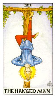 伟特牌中,吊人的头上有一层光环,这就告诉我们,通过学习如何将痛苦和悲伤转化为课题和动力,我们将会颠覆自己原先受限的思想、重释我们的生命,揭开外在的表象,深入内在本质,学着去看藏在表面底下的东西,就像深扎在下方的吊人之头。这样,我们从外部转向了内部,引发意识和观念的逆转和转变,就像将我们原先普通、平凡的观念作出180度的逆转。