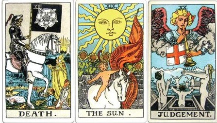 以伟特塔罗牌为例,大牌牌图里出现旗帜的一共有三张牌:死神、太阳、审判。