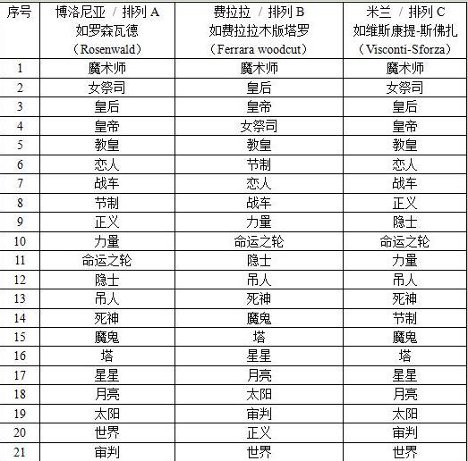 在对塔罗图意之源作分析前,首先要解决的是塔罗大牌的原始排列问题,即塔罗起源之初,其原始塔罗牌中的大牌排列顺序。