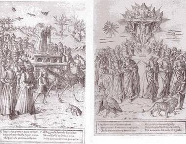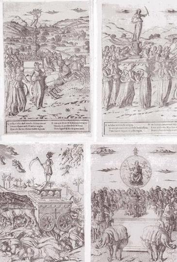 根据这部诗篇所创作的艺术图像是以战车作为一种象征与形式,随着主题的不同,战车的形象也会有所不同,并且在战车周围还配有与各主题内容相关的历史、神话的符号。彼特拉克的这部诗篇激发了许多艺术家去创作图像来表达一些含有寓意的艺术作品。这些图片可见下: