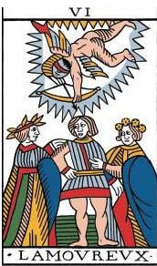 再如恋人牌,其“选择”的牌意应该为不少人所知晓,但是很少有人知道这个意思的来源和原因,毕竟单看伟特牌图像并不能看出“选择”这项意思。但如果通晓马赛塔罗牌,那么马赛塔罗的恋人牌图无疑充分显示着“选择”这一牌意——一位男子头戴桂冠的女子和头戴花环的女子中作出选择,这里,头戴桂冠的女子代表“美德”,头戴花环的女子代表“欲望”,他们头上的丘比特没有被蒙住双眼(有些牌中的丘比特符号往往被蒙着双眼),所以这里强调了这种选择是有意识的选择,而非无意识。