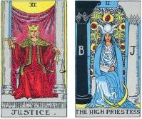 出生年月日相加后得出11和2的人拥有“正义&女祭师”出生牌。这一组合的人如果能平衡好这两股对立能量的话,会拥有很多不同种类的朋友,会被神秘学吸引,在生活中的很多方面都会抱着完美的梦想。这一组合的人群也会一生都徘徊在极端之中,比如说时而安静,时而嘈杂,时而安稳,时而毛躁,时而温和,时而攻击性强。该组合的人还有一个特征,那就是想的、说的永远比做的东西要多!他们很擅长于想事情、说教,可是要他们把自己的好主意和完美的理想实践在这三维世界中就有点难度了。他们很喜欢陶醉在知识和完美层面的世里。