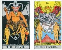 出生年月日相加起来得出15和6的人拥有“恶魔&恋人”出生牌组合。此组合的人都很有幽默感,很有喜剧才华,常常能让身边的人感到愉快感和带来欢笑。他们还很有魅力,很有吸引力。此组合的人都得经历各种人与人之间的关系课题,其中爱情课题尤其得重要。不过当他们平衡后,此组合的人群能知晓宇宙中的秘密,他们明白万物是如何运作的,如何都融洽地融入到一起的。他们拥有这和谐的能量和礼物!
