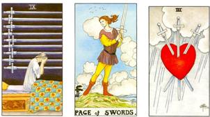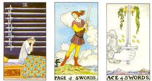 左边第一张牌是宝剑九,画出一个人坐在床上,双手捂着脸表达了悲痛与恐惧,9把宝剑挂在半空穿越此人,象征无法消除这些痛苦的思想。由于牌面中的人物朝着右边,向右的方向代表即将到来的事物,即对快到来的事物的担忧。第二张牌是宝剑侍从,描述了一个年轻人举着宝剑,宝剑的方向为右方,积极正向的方位,他看起来内心已经准备好针对激烈的环境采取积极的行动,他的身体同样朝着右方,但头部却面向左,面对着代表恐惧的宝剑9,可见虽然他行动上试图去矫正一个恶劣的情况,但内在的心理层面上却被恐惧和疑虑所吞噬,但他仍通过树立自己的信心来掩饰自己的恐惧,宝剑侍从的右边是宝剑1,象征这个举动所带来的后果。