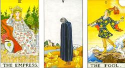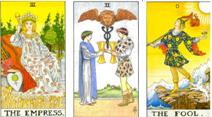 把三张牌合起来看,我们就会得到与前一个例子所不同的故事。愚人看上去正要朝着吸引人的、富足的皇后这边前进,然而在他抵达目标对象之前,他需要作一些牺牲和改变,或许他需要更多一些责任感,而不能总是仅凭一时冲动行事,也不能总被飘忽不定的想法牵着到处乱走,但无论需要作出什么剔除,他都觉得无法忍受。这时他已经看不到自己将会获得什么,也就不再前进。如果求问人就是愚人,那么就应当自问一下,这项行动所能得到的课题是什么。再者,取决于不同的问题,这局牌面能够作出不同的象征,可能说出如果我们不对这类自发性行为进行一些控制(把它们的地位放于过高),那么则可能造成一些不好的影响——会阻止我们承担责任、遵守承诺、甚至会影响我们自我的繁荣。