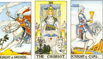 战车描述的是一个战士,已经学成了神秘学的启蒙,披装戴甲准备迎接挑战。战车牌的两旁,是两张骑士牌,行动方向是自中间向两边。这三张牌说的是,两位骑士是战车的延伸,为什么这么说,因为战车是大阿卡纳,主要是内在心灵与精神层面,而两张骑士牌则是将战车带入了现实的物质世界,是由内在带向外在的延伸。右边是圣杯骑士,行进缓慢,手持圣杯,貌似他再寻求某些支持或精神的实行。而左边的宝剑骑士寻求的似乎是战斗,杀死一切他认为该杀的东西。