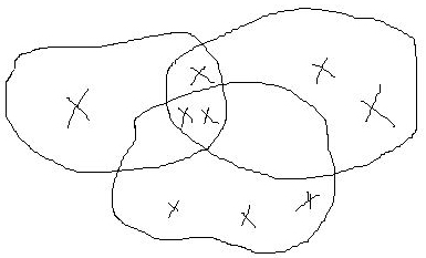 如图所示,每一个阿米巴虫代表一张牌,三张牌所重叠的部分有两个叉叉,代表此三张牌有两方面的牌意是互为类似;有两张牌重叠的部分有一个叉叉,代表这两张牌有一方面的牌意类似。这就是实占读牌时所需要考虑到的因素——牌意之间相互共鸣、相互激活。(在后几章里面,我们将说到塔罗Dignity,即牌与牌之间基于某些特定原理上的关系。)另外,对牌面图像的解读是一种凭直觉读取获知的方法,但同样也可以运用阿米巴的方式来理解并找出牌与牌之间的联系(如,伟特牌中有好几张牌里都有出现柱子、月亮等相同或相似的符号。)