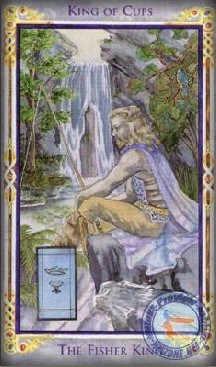 首先对圣杯国王这张牌进行描述,这张牌底下的名称是“钓鱼国王”:“在国王的右边有一个瀑布落入水池,水池周围环绕着一些岩石和植物,国王就坐在水池旁边,手持一根长杆,长杆的另一头随着细线直下水面,一只蓝色的鸟坐在国王身后的一棵树上。国王看上去神情有些忧郁,似乎在想一些心事或是一些渴望的事。”所以描述到这里可以问一下自己:“我渴望什么?”得到的回答是:“一个失去的机会。”