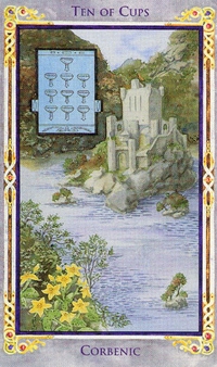我对这张牌构出的故事是,骑士抵达了并进入了灰蒙蒙的城堡,他知道这里没有他要的东西所以就回到了美丽的森林。由于圣杯10里没有人物,我将自己与城堡的特质作出联系——坚固、神秘、独立,使我考虑到自己在写作、学习中是怎样隔离自己的。我对书中牌意的概述是安全的生活是没有永久固定的地点的,是真正的精神上的探求。