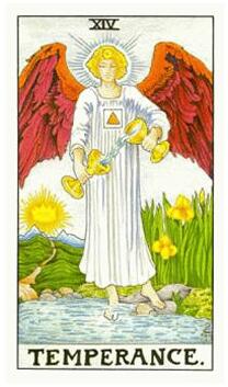 节制这张美丽的牌,牌面是一个人物把生命之水由一个金瓶倒进一个银瓶里面。这张牌就跟它的牌名一样,意思是节制和平衡。节制(Temperance)源自拉丁文的temperare,混合着节制、和谐的意思。需要耐心时,节制这张牌就会出现。你目前所处的位置成就不了大事,在生命能源结合的同时,除了等待外,你什么事也做不了。学习优雅和有建设性的等待,是一门非常值得学习的艺术。别做任何事,留神进行心灵过程。了解总会有做不成事情的时候,也要明白,其实没有事情需要去做。待在优雅、放松的状态里……这是禅师其中一个最伟大的功课。