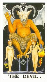 恶魔是另一张令人害怕的牌,牌面上的恶魔经常头上长有一对角,脚上有蹄,有一条毛茸茸的尾巴和握着一根铁粑。前面有一男一女的人类被铁链锁在一起,但链子是松垮垮的,暗示自我设限。