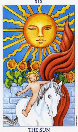 小孩是全裸的,代表着他无可挂碍,无可隐瞒,小孩拥有一颗纯然的心,对待万物都是纯真无邪的。他在马背上张开双臂,这里与小阿卡纳中的骑士牌不同,马背上没有马鞍也没有缰绳,没有任何装备,小孩就坦然地跨在马背上,表示内心深处的安定和对白马的完全信任,他似乎从来就不需要控制马匹,他们已经协调地融为一体,无论面对何种境遇都能够活动自如。不用手就能面带微笑的控制白马,证明他有足够的力量轻而易举的控制一切。这并不是盲目的自信,从愚人走到了太阳,证明所有的事情都一帆风顺,而且是可以全方位的成功。这个过程的乐观、目的、理解、热情、选择、感情、力量、智慧、顺从、束缚、希望、恐惧都会成为你今后最宝贵的财富,更是你走下去的依仗。小孩的心灵已完全觉知,而白马代表着纯然的动物本性,他们的协调也代表着小孩觉知的意识层面和白马无觉知的潜意识层面合二为一。小孩在马背上张开双臂呈“大”字形状,仿佛要拥抱世间的一切,他的内心似乎十分满足,由内而外充满着全然的喜悦。小孩和白马,意识与无意识结合,在完美的融合状态下,愉快地面对未来的一切。