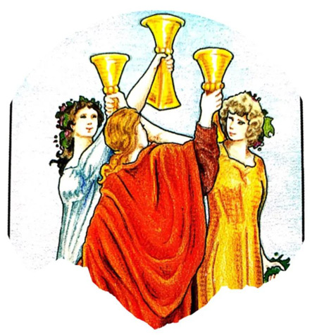 圣杯三中的三位女性高举着手中的圣杯,她们在分享着自己感情的胜利,她们是爱的付出者,也是爱的收获者。