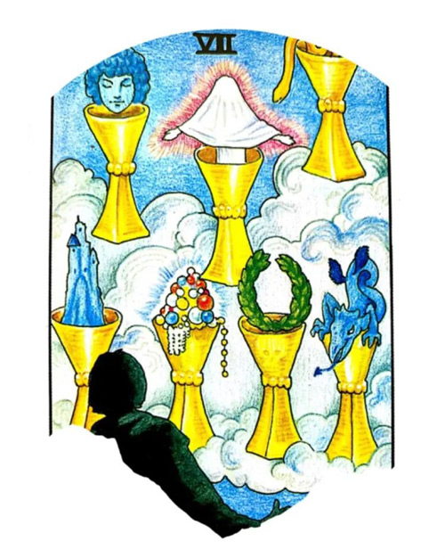 圣杯七中的男子是一个拥有者,他已经拥有了眼前圣杯的这些事物,但是随着圣杯的内在被充满,他没有办法在这些圣杯中得到多余的快乐,于是他开始进入了深入反思:这些东西真的可以给他带来满足吗?这些东西真的持续让他快乐吗?这些东西存在背后的真正意义究竟是什么?