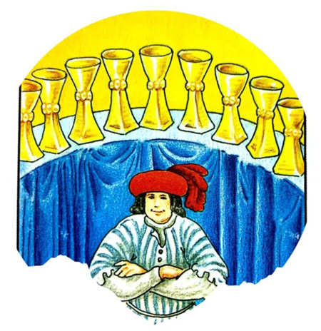 蓝色的幕布前男子正双手交叉,为自己背后的九个圣杯洋洋自得,从圣杯的数量看得出,他有着丰富的情感经历,说的婉转一点就是风流倜傥,说的直白一点就是处处留情。