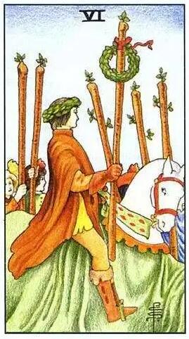 权杖六是5+1的组合,还记得在权杖五中拿着权杖互相斗争的五个人吗?他们的斗争没有任何有益的结果,相反是没有参与斗争的人赢得了胜利。