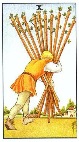 权杖十一般 伴随着一种态度:如果你想做好,你必须自己做。你觉得自己责任重大,所以你不能相信别人能完成这项工作。它也可能是在描述某个自雇型的人,他亲力亲为以保证工作的完成。或者它也可以描述你承担了一些不属于你责任范围的事情,例如,觉得有必要为另一个人承担责任。权杖十暗示你不能对你伴侣的决定、行为或信仰负责。