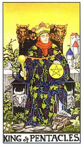 他的宝座是棕褐色的,有四头牛角的雕刻造型,星币国王有着金牛座的性格特征,低阶的金牛座很容易将自己沉浸在物质世界的享受之中,也就是此时国王的状态,金牛座很喜欢占有,也很容易拥有自己想要的物质,从这些物质中走出选择放下反而是困难的,也是金牛座要面对的生命课题。