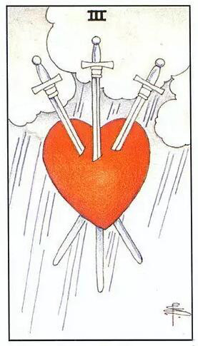 宝剑三是宝剑二的后果,宝剑二中的女子一直觉得外在在伤害她,但是事实上她一直在被自己伤害。她用来防御别人的两把宝剑最后深深插入了自己的心里。