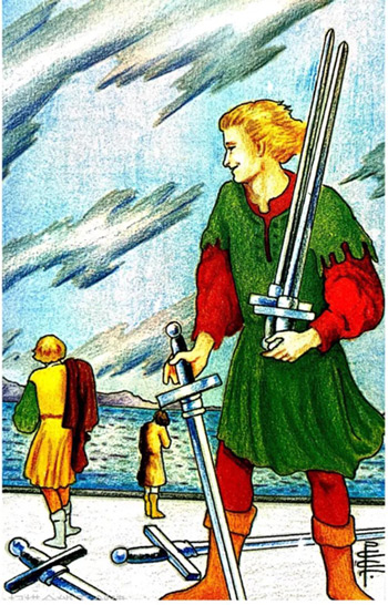 面对画面的男子手中抱着3把宝剑,1把向下,另外2把向上,两把宝剑方向的不同代表他自己的想法和语言也是矛盾重重,他是一个思维比较混乱的人,是一个说话很容易伤害到别人的人,也可能是一个谎言制造者。