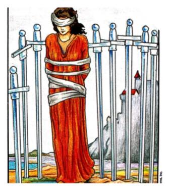 八把宝剑垂直向下插入地面,呈现的形状像是围栏和监狱的栏杆。此时充满着被束缚和困顿的感觉,因为你的眼睛被眼罩遮盖,所以你只是能感受到自己被一些东西束缚住了,充满着不自由感,但是却不知道束缚住自己的那些东西究竟是什么(能感受到却看不到)。你想离开目前的困境但是却不知道该怎么办(身体被束缚住)。