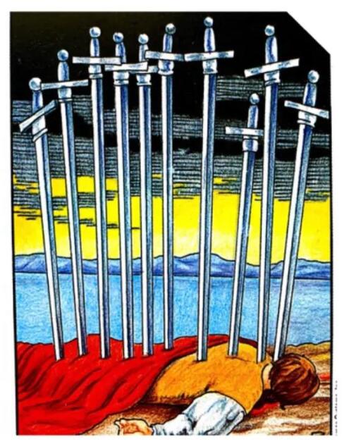 数字十是一种合一,宝剑十是一种意识的合一,在意识合一中你感受到你伤害别人的思维模式其实也在伤害着自己,看似你的生命被别人伤害着,其实是被自己伤害着。此时你没有办法帮助自己拔出宝剑,你彻底失去了自救的意愿和能力。