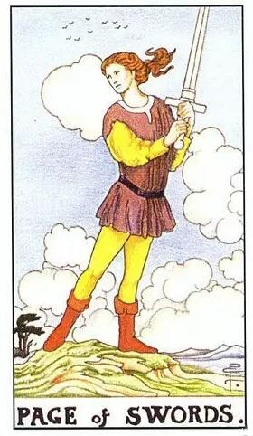 宝剑侍从的宝剑是倾斜的,代表此时此刻她说的话其实不是她真正想表达的,她听见的消息也有可能是假消息,她的思维其实并不认可大众的普遍认知,但是她仍然选择了顺从和接受,她正在背离着自己内心真实的声音。