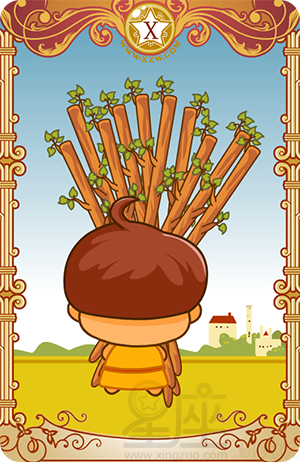 这些情况和问题在你开始对他们厌烦时,它们并没有离开,而是似乎向你要求更多的时间、注意力和热诚。权杖十暗示着该是将这些负担或责任委托给最能妥善处理好它们之人的时候了。