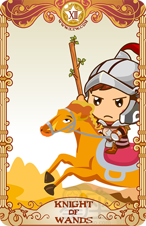 权杖骑士所代表的是火当中的火元素。这张牌可以象征行动、旅行、改变以及为了自身缘故的活动。瞄一眼这张牌就会得到火、活动、热情及活力的印象。